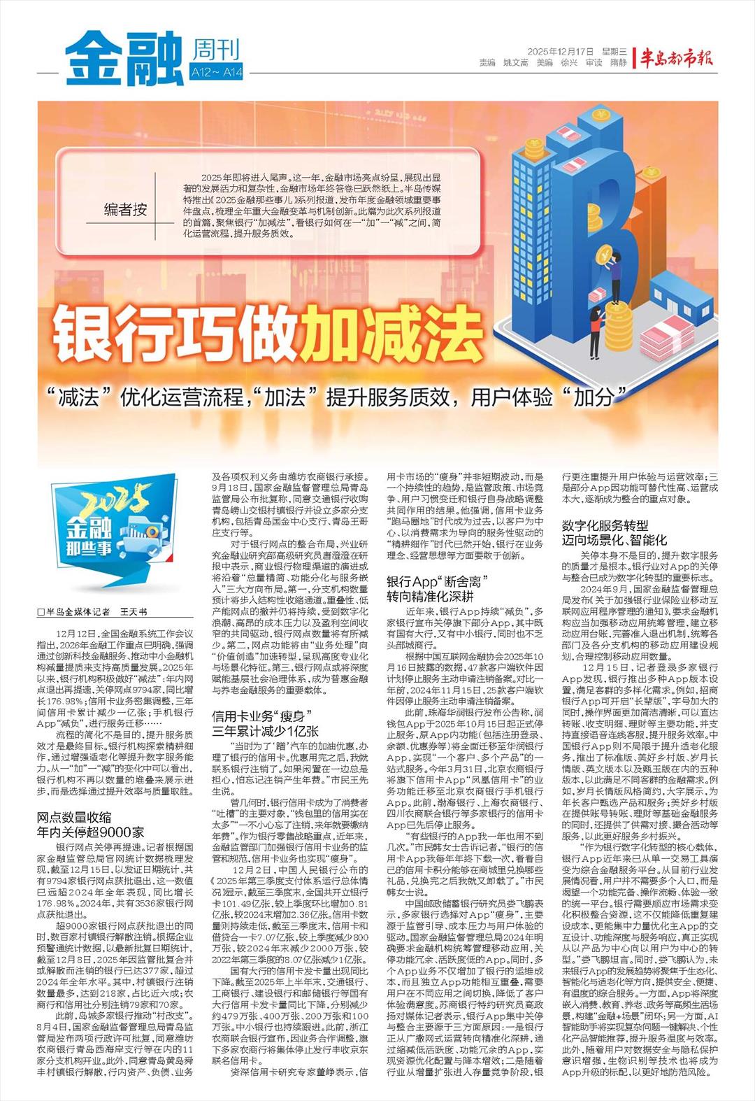 2025年即将进入尾声。这一年,金融市场亮点纷呈,展现出显著的发展活力和复杂性,金融市场年终答卷已跃然纸上。半岛传媒特推出《2025金融那些事儿》系列报道,发布年度金融领域重要事件盘点,梳理全年重大金融变革与机制创新。此篇为此次系列报道的首篇,聚焦银行“加减法”,看银行如何在一“加”一“减”之间,简化运营流程,提升服务质效。