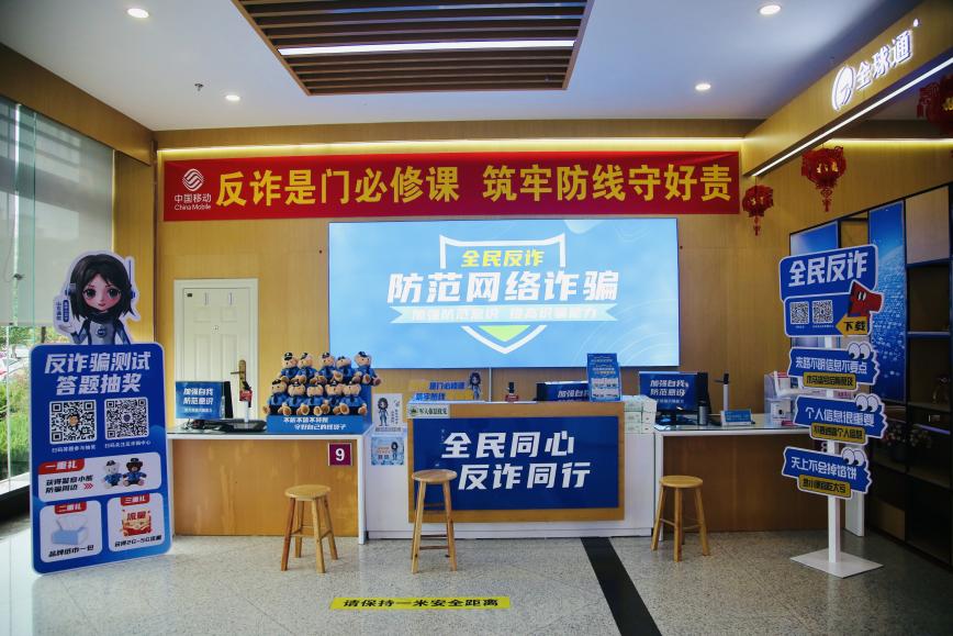 为将服务工作与反诈深度融合,山东移动东营分公司创新性打造东营市首个运营商“反诈示范营业厅”、设立专属反诈咨询台,配备专业讲解员,为办理业务的客户提供“一对一”定制化宣讲服务。依托营业厅电子屏、等候区等区域,循环播放反诈公益广告、典型案例警示片,打造“进门能看、坐下能学、咨询能问”的沉浸式反诈氛围。将反诈宣传工作嵌入核心业务流程,主动开展风险提示,引导进厅客户安装国家反诈App,实现“一次业务办理、一次反诈护航”。