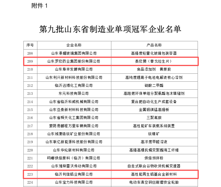 近日,罗庄区罗欣药业集团股份有限公司、临沂利信铝业有限公司2家企业成功入选山东省工业和信息化厅公示的第九批山东省制造业单项冠军企业拟认定名单。