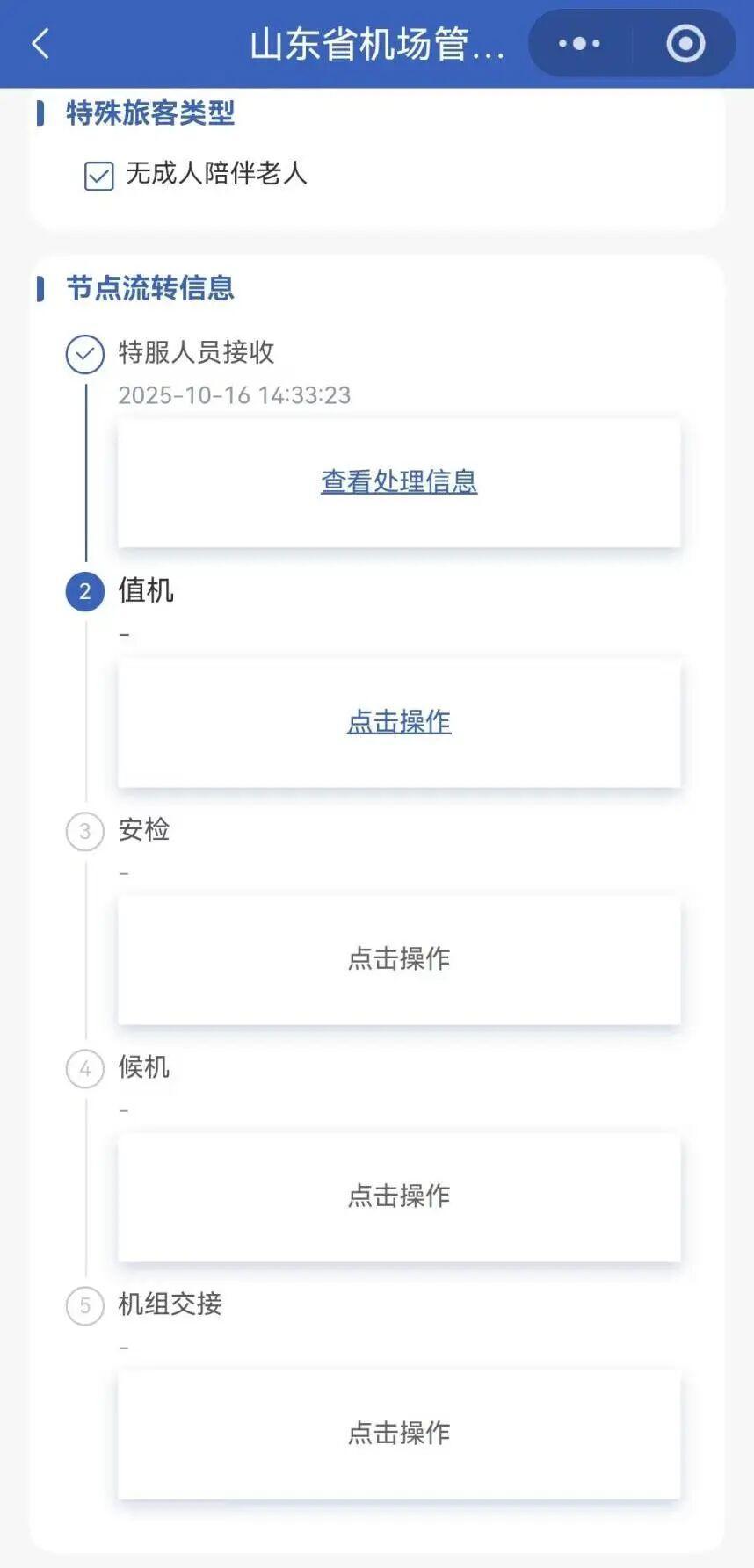 乘机当天,特殊旅客行程开始后,可随时通过微信小程序查阅服务保障进程,还可以点击各保障环节实时查阅旅客在各乘机节点的照片,让家人放心、安心。