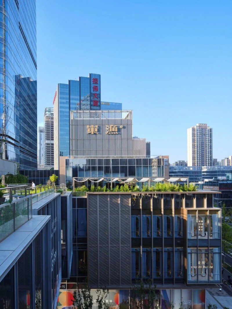 步入前厅,几何切割的“礁石”吧台与海水冲刷质感的墙面形成强烈视觉冲击,灯光映照下宛如置身潮间带;主餐区 7 米挑高空间里,悬吊的巨石铜墙艺术装置搭配 LED 动态潮汐影像,让“海天辉映”的沉浸感扑面而来;每间包房独成一景,借老船木艺术品、海礁石墙面、做旧铜板等材质,演绎“一房一海景”的观景节奏。当近5米高的包房大门在挺拔中与三角铜雕把手的厚重和谐呼应时,当代几何语言对齐鲁礼仪的传递也得到了巧妙的完成;露台区域则完美衔接济南 CBD 城市天际线,实现 “都市繁华”与“自然静谧”的对话。