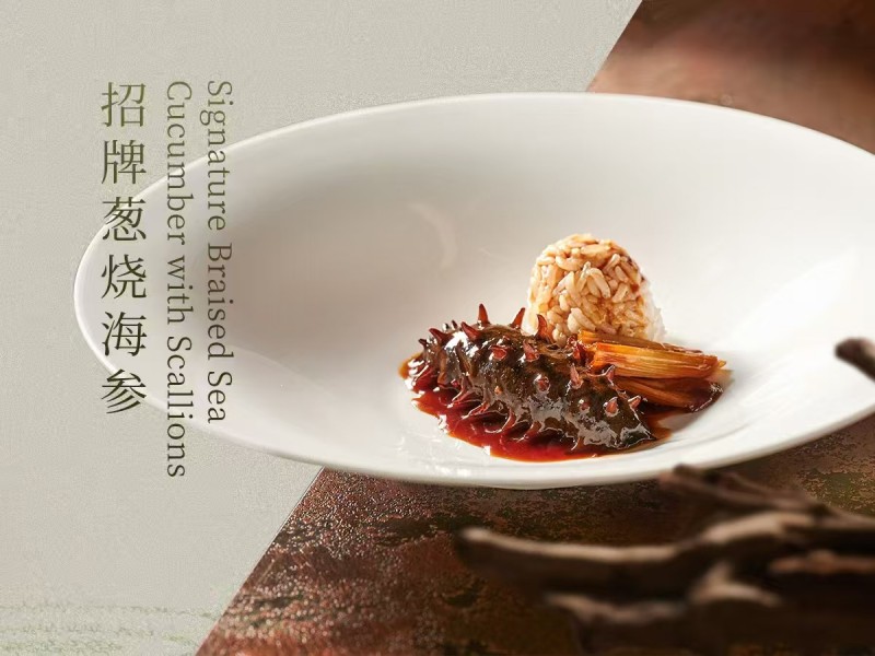 【招牌葱烧海参】传承自“海参王”王义均老先生,跳出传统干参发制的固有模式,选用鲜活海参入馔。通过反复研发攻克活海参不易入味的行业难题,相比干参减少多道发制工序,最大程度保留了海参的原生营养与弹嫩口感,搭配章丘大葱的焦香,成就“传承不守旧”的经典演绎。