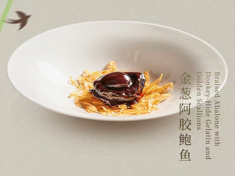 【金葱阿胶鲍鱼】是崬渔的原创菜品,也是对鲁菜经典名菜的一次标志性创新,堪称山东双宝的巅峰对话。烟台砣矶岛的活鲍鱼和阿胶两种极具代表性的山东食材,通过鲁菜的传统烹饪技法——“酥”,将鲍鱼的弹牙和阿胶的黏糯完美结合,又搭配了章丘大葱制作的脆葱,独特的葱甜勾勒出更富层次的味觉体验,一道菜便使传统技法的魂与在地食材的美相得益彰,每一口都是齐鲁风物的浓缩。