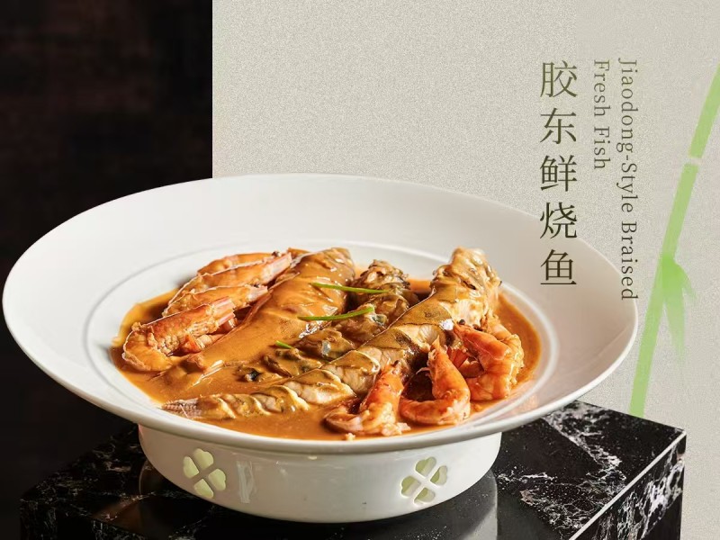 鲁菜中,烧鲜鱼最是常见,又最是考验一个“鲜”字。崬渔的【胶东鲜烧鱼】,通过在济南门店搭建的专属海水养殖系统,实现海鱼现捞现做的鲜活承诺。在鲁菜酱焖技法基础上,融合多菜系烹饪思路创新出 “鲜烧” 手法,不依赖重酱掩盖鲜味,而是以姜葱提香、原汤收汁,让海鱼的鲜美与肉质的细嫩成为味觉主角,也与空间 “海之润泽” 的核心立意完美呼应。