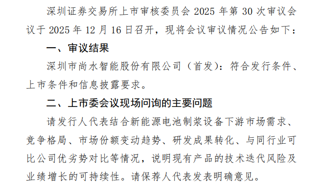 12月16日晚间,深交所公告显示,上市审核委员会2025年第30次审议会议当日召开,深圳市尚水智能股份有限公司(以下简称“尚水智能”)首发过会。