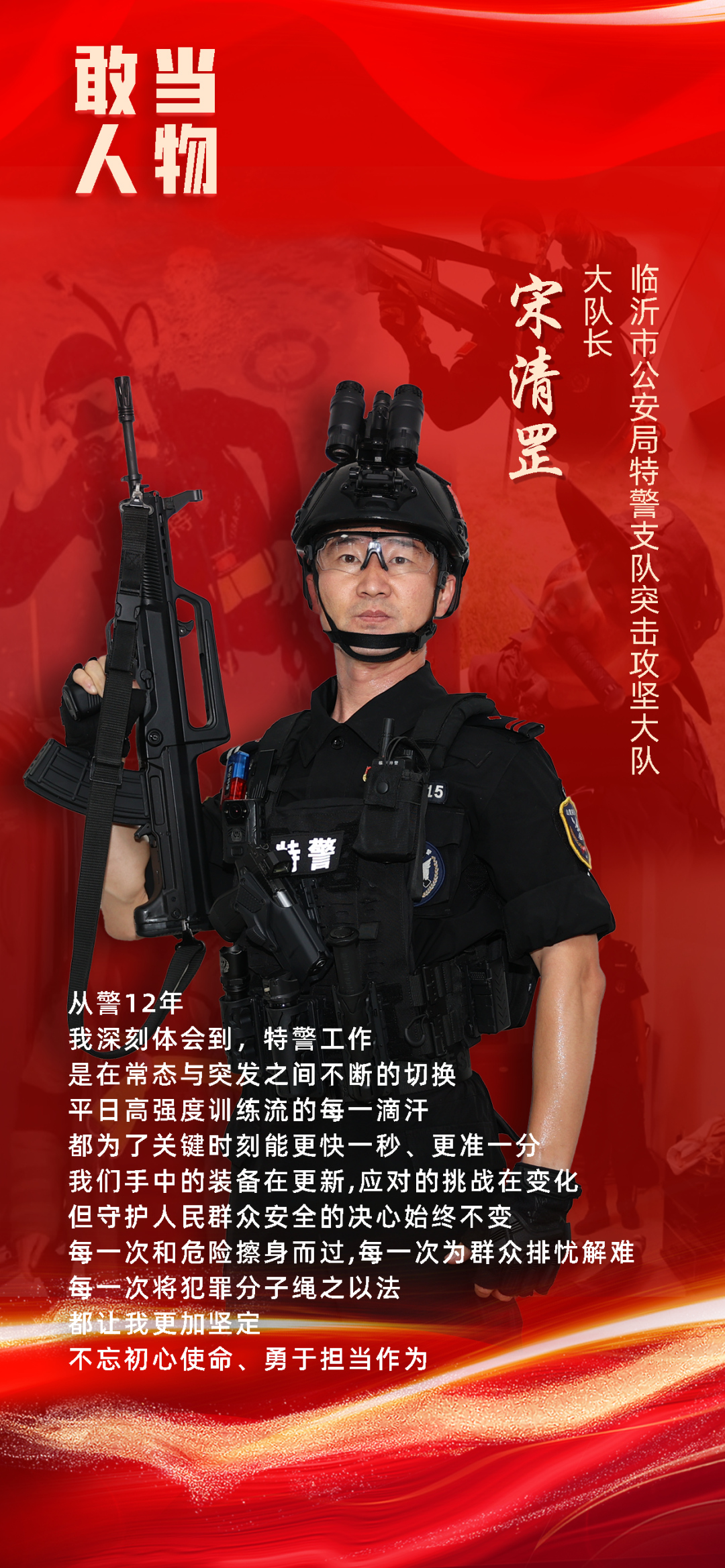 宋清罡,2004年12月入伍,2013年1月参加公安工作,现任临沂市公安局特警支队突击攻坚大队大队长。荣立个人一等功、二等功各1次,三等功3次,被公安部评为“全国公安机关成绩突出青年民警”“全警实战大练兵标兵个人”,先后被评为“齐鲁最美警察”“山东好人”等荣誉。