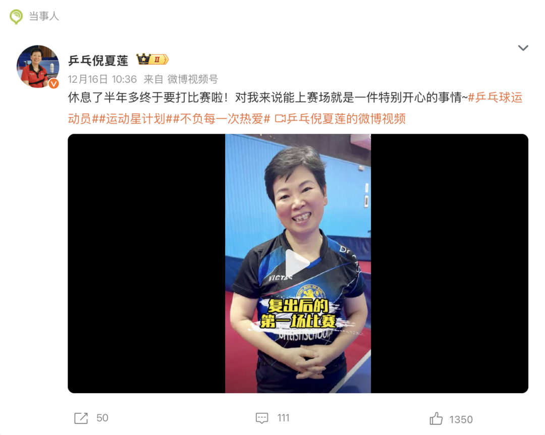 12月16日,乒坛传奇人物倪夏莲在社交媒体正式宣布伤愈复出。