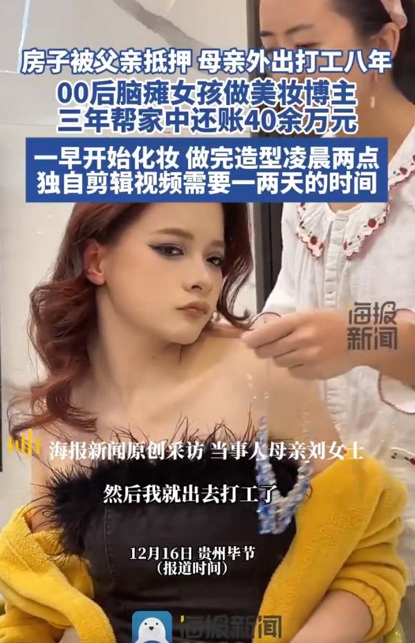 12月16日(采访),贵州毕节。房子被父亲抵押,母亲为生计外出打工八年,00后脑瘫女孩扛起家庭重担。她从清晨开始化妆做造型,常常忙到凌晨两点,独自剪辑视频又要耗上一两天,靠着做美妆博主的收入,三年帮家里还了40余万元债务。