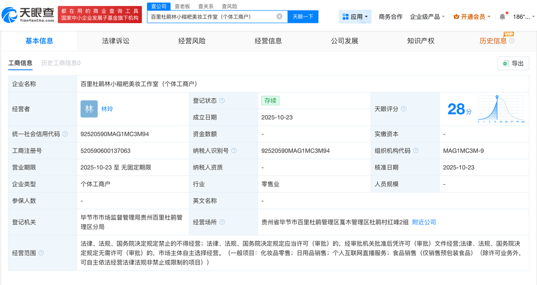 天眼查App显示,今年10月,百里杜鹃林小糍粑美妆工作室(个体工商户)成立,经营者为林玲,经营范围包括化妆品零售、日用品销售、个人互联网直播服务等。