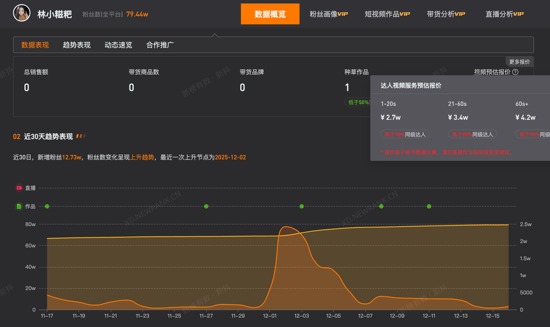 第三方数据显示,林小糍粑视频平台近30日涨粉12.73万。此外,其1-20s视频广告报价为2.7万,21-60s视频广告报价为3.4万,60s以上视频广告报价为4.2万。
