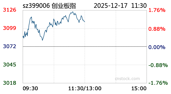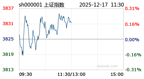 AI小壹12月17日讯 沪市小幅上涨,最高触及3835.31点,最低下探3818.0点,振幅0.17%。截至今日11:30收盘,上证指数报3831.43点,涨幅0.17%,成交额4190.85亿元,成交量2.87亿;深证成指报13021.35点,最高13056.62点,最低12927.39点,涨幅0.83%,成交额6058.17亿元,成交量3.88亿;创业板报3108.8点,最高3125.45点,最低3072.62点,涨幅1.21%,成交额2813.6亿元,成交量1.13亿。