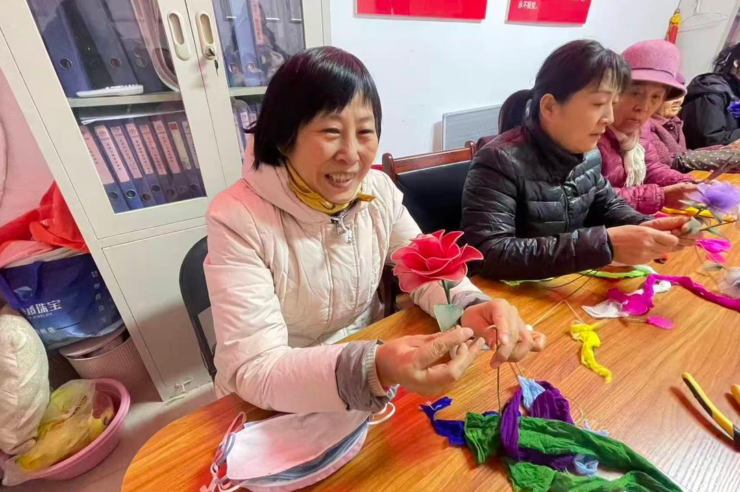 【泉心泉艺・乐有所享 】指尖生花映笑颜 邻里欢聚暖意浓——滕州龙泉街道荆善社区新时代文明实践站开展“妙手成花 乐在指尖”手工制作丝网花活动