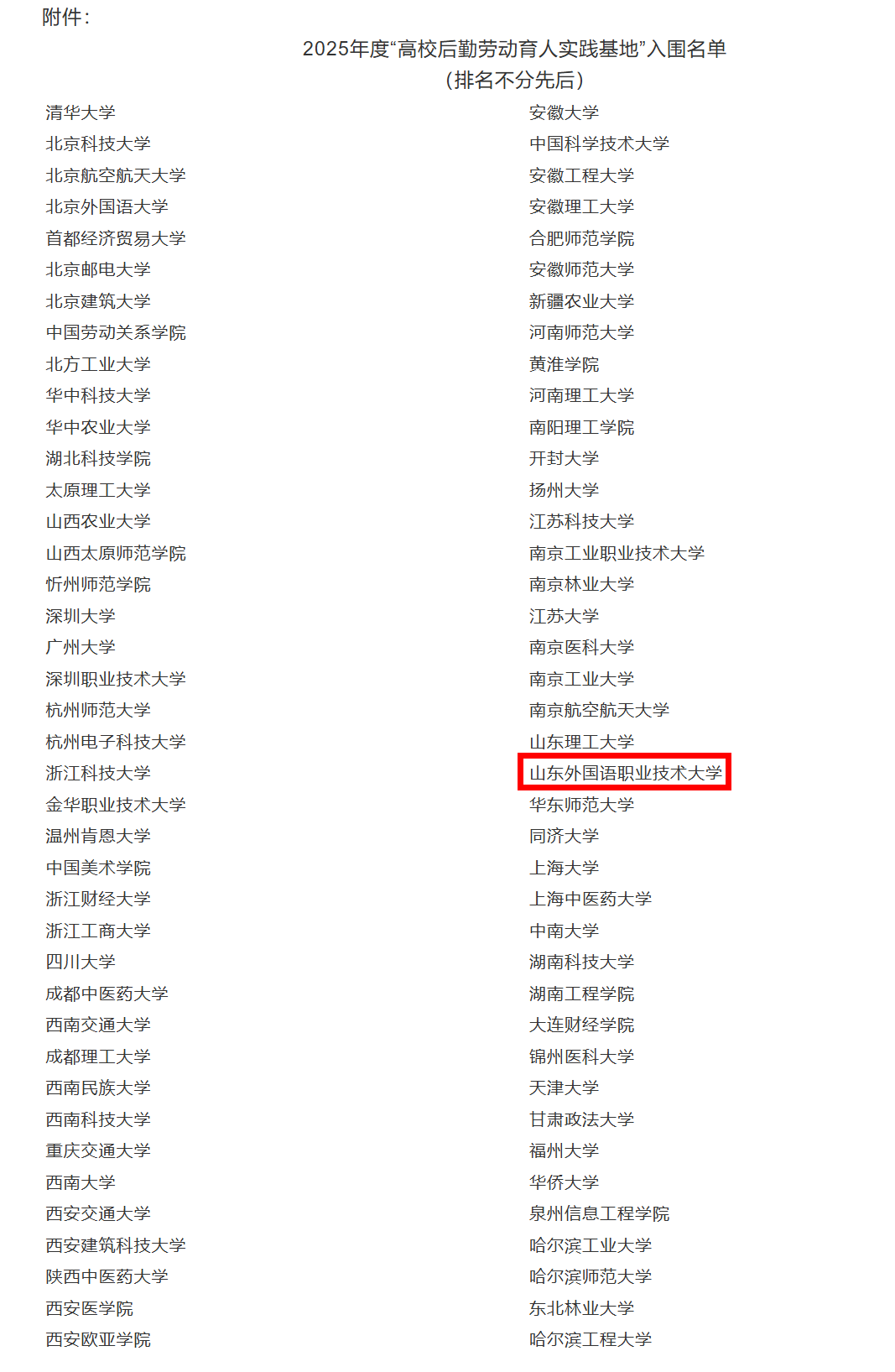 近日,中国教育后勤协会正式公布2025年度“高校后勤劳动育人实践基地”入围名单,山东外国语职业技术大学成功入选,成为全国入选的80所院校之一。