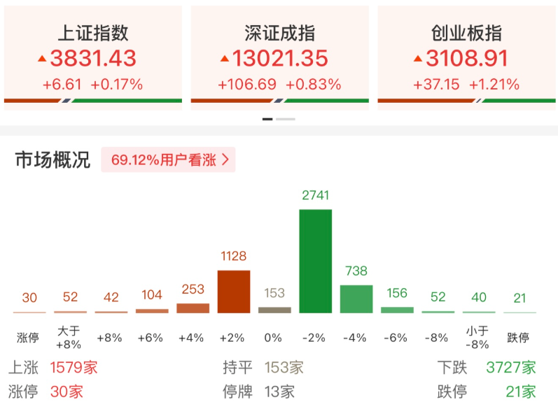 今日早盘,A股市场沪指窄幅震荡,创业板指涨超1%。黄白二线分化明显,微盘股指数跌超1%。沪深两市半日成交额1.02万亿,较上个交易日缩量987亿。盘面上热点快速轮动,全市场超3700只个股下跌。