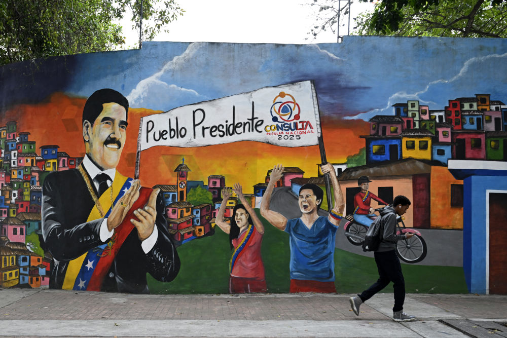 12月2日,在委内瑞拉首都加拉加斯,行人从支持委内瑞拉总统马杜罗的涂鸦墙前走过。新华社