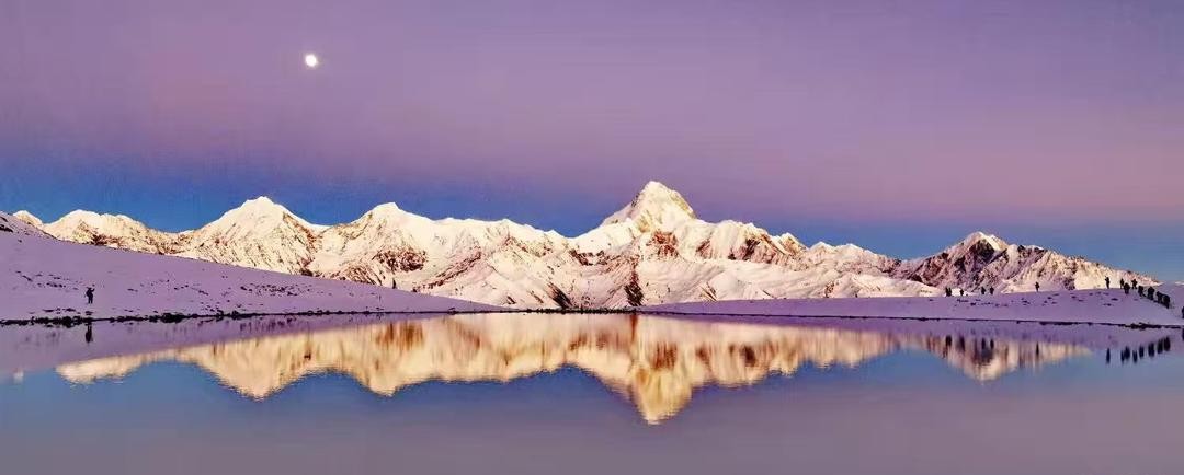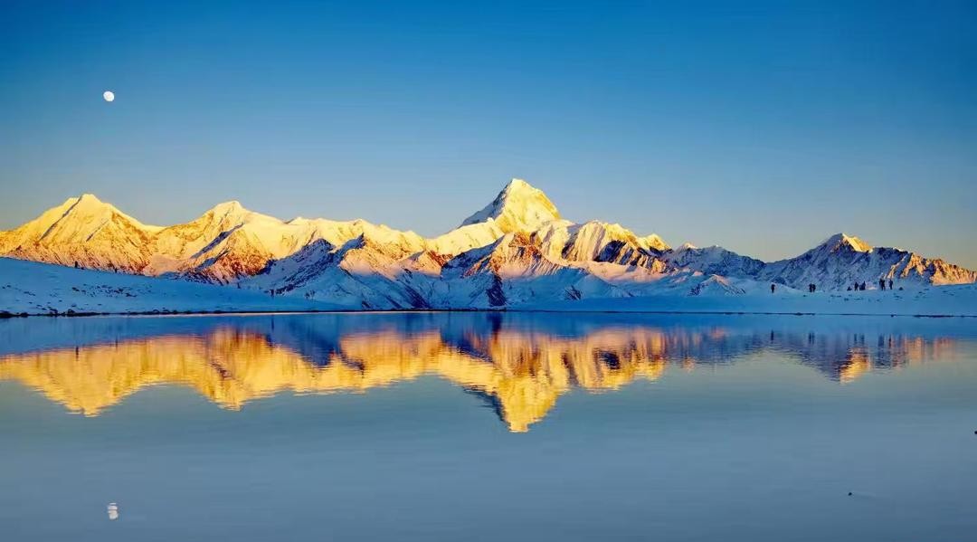 六点开始,天色开始变化,湖山慢慢由淡蓝到浅红,再到金黄,原来银装素裹的贡嘎主峰,完全是另一副模样。一轮圆月在它的上方,真是仪态万方,荣耀华贵。一刻钟不到,光淡了,暖色退去,一层蓝色笼罩下来,山和湖覆上了厚厚的冷调。
