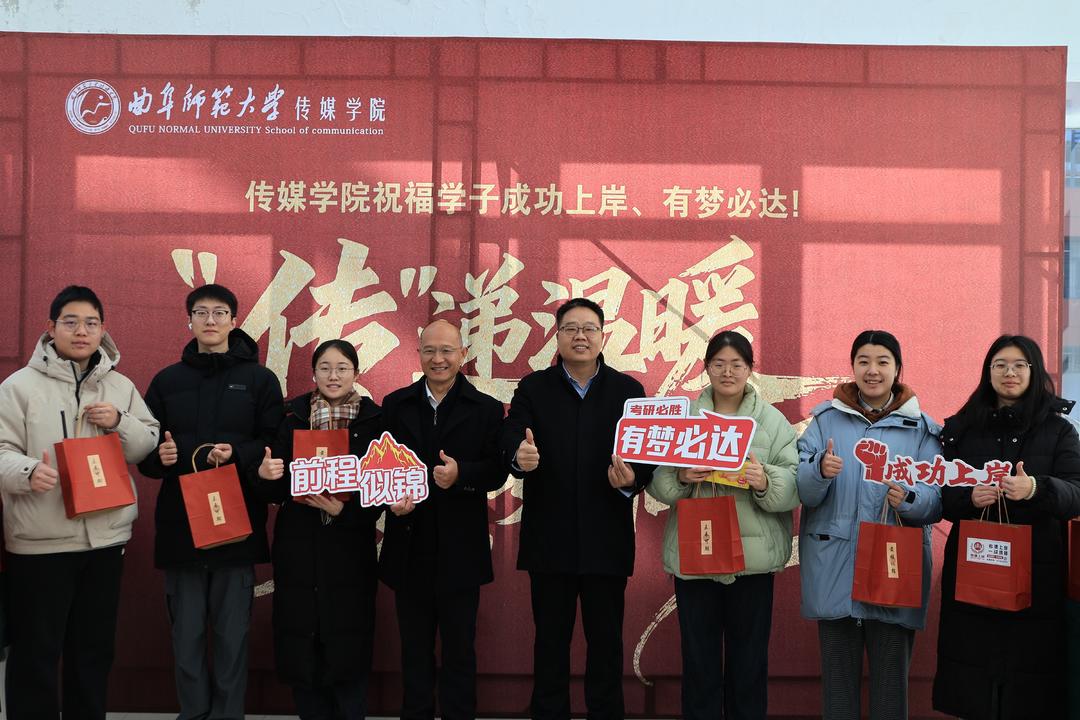 2026年全国硕士研究生招生考试即将于12月20日至21日拉开帷幕。为帮助备考学子舒缓压力、提振迎考信心,12月15日,曲阜师范大学传媒学院精心策划并开展“传递温暖,媒好同行”助力考研送温暖活动,学院领导与教师代表亲临现场,为逐梦学子送上满载关怀的助力礼包与真挚祝福。