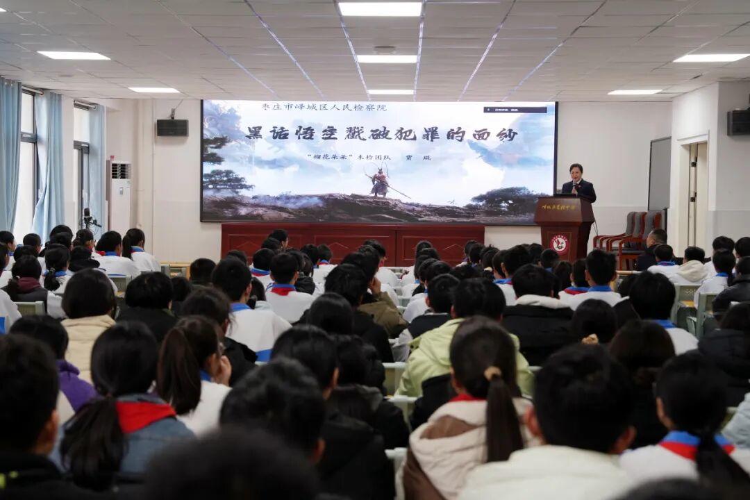 2025年12月16日,枣庄市峄城区人民检察院“青未了·榴花朵朵”未检团队走进青檀中学,开展了一堂别开生面的“重走西游之路·争当守法大圣”主题法治课。活动采用“线下授课+线上直播”双轨模式,为全校1300余名学生带来一场沉浸式法治体验,以趣味化表达打破法律知识壁垒,筑牢青春安全防线。