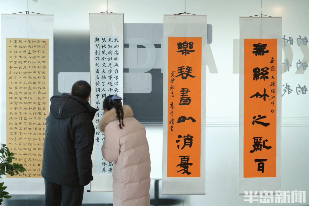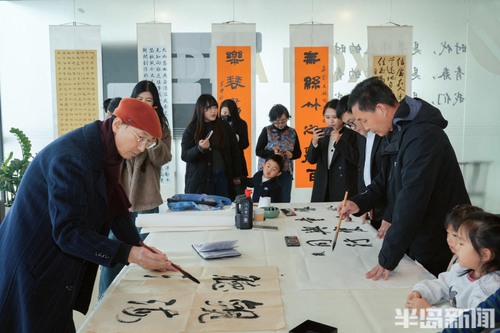 高伟、刘鑫与青岛西海岸新区书法家协会名誉主席陈志向、鲁网青岛新闻采编中心主任、青岛爱心角志愿服务中心党组织书记薛同春等共同观展,并就作品创作理念、艺术与生活融合等话题进行了深入交流。