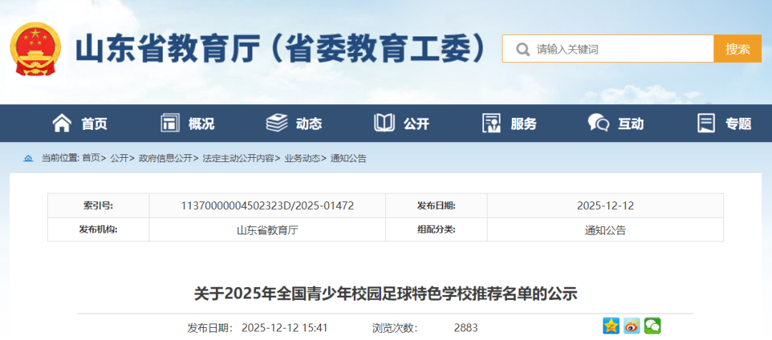 为深入贯彻落实党中央、国务院对发展校园足球特色学校的重点任务要求,有序推进校园足球特色学校高标准扩容,根据《教育部办公厅关于开展全国示范性特色学校创建工作的通知》(教体艺厅函〔2025〕37号)要求,我厅组织开展了2025年度全国青少年校园足球特色学校申报工作。经各学校自主申报、各市审核推荐、组织专家评审,拟推荐255所学校为全国青少年校园足球特色学校。现将推荐名单予以公示,公示期为5个工作日。