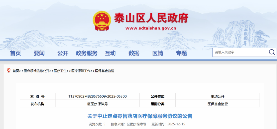 12月15日,泰山区人民政府网站发布关于中止定点零售药店医疗保障服务协议的公告,详情如下: