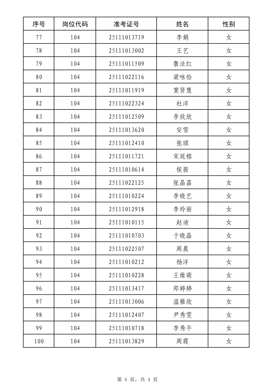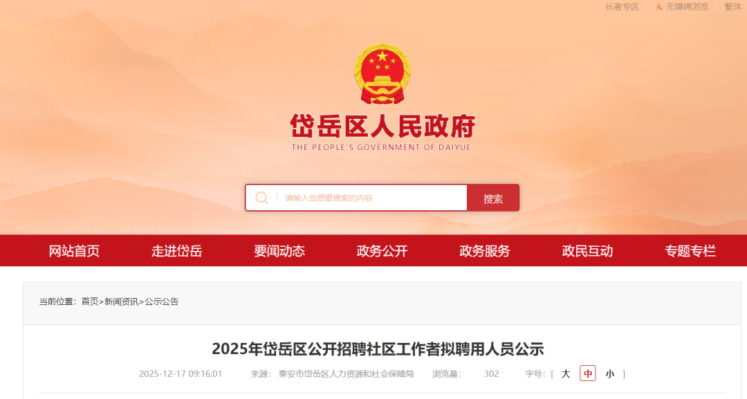 12月17日,泰安市岱岳区人力资源和社会保障局发布2025年岱岳区公开招聘社区工作者拟聘用人员公示,共有100人拟被聘用,名单如下: