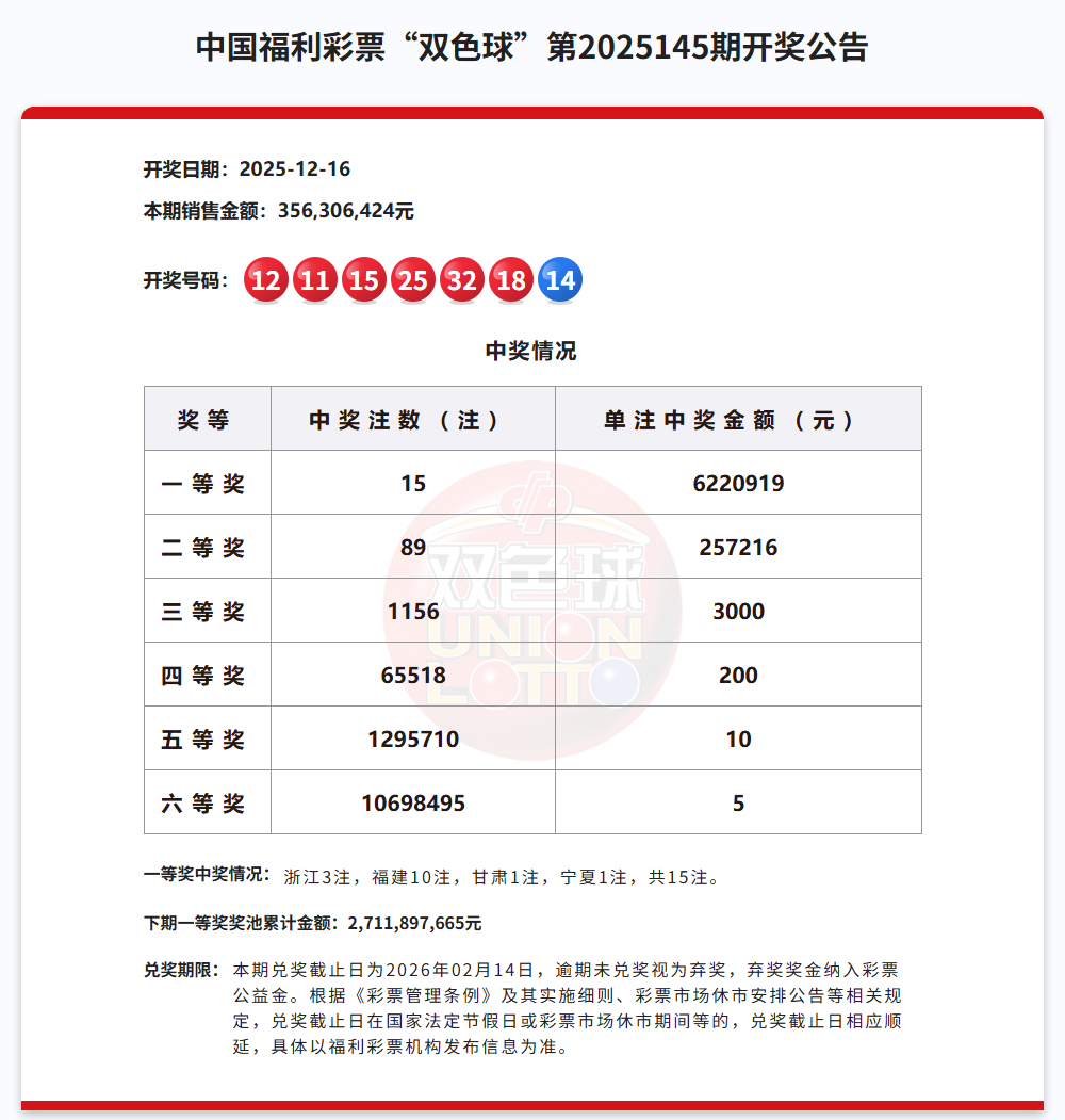 双色球开奖第2025145期12月16日开奖号码一等奖浙江3注福建10注甘肃1注宁夏1注奖池金额2711亿元本期销量356亿元筹集公益金128亿元量力而行理性购彩来源中国福彩微信公众号