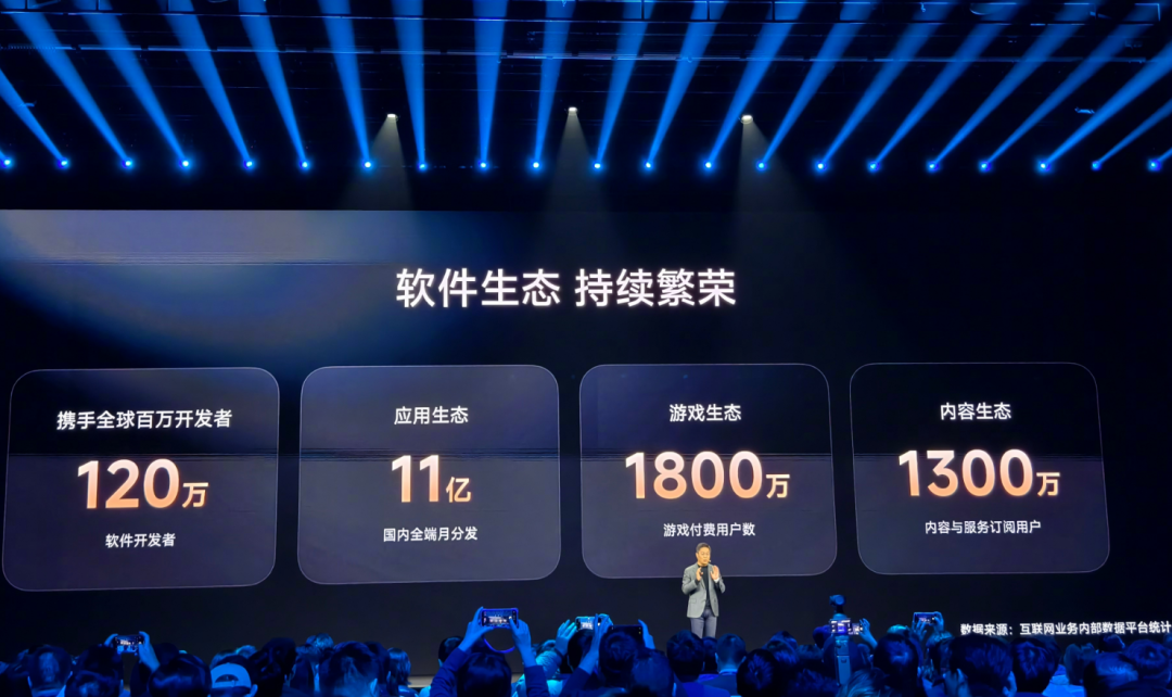 卢伟冰回应小米自研大模型开源上线,他公布了小米软硬件生态最新进展。软件生态方面,拥有120万全球软件开发者,国内全端月分发11亿,1800万游戏付费用户数,1300万内容与服务订阅用户。