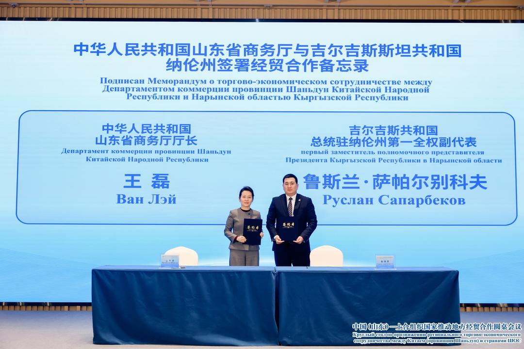 在中国(山东)—上合组织国家推动地方经贸合作圆桌会上,中、外方嘉宾围绕落实《上合组织地方经贸合作大会青岛倡议》,白俄罗斯莫吉廖夫州经济署、哈萨克斯坦阿拉木图市政府、吉尔吉斯斯坦经济和商业部、塔吉克斯坦杜尚别市森纳区、乌兹别克斯坦费尔干纳州经济和财政厅,就建立完善地方经贸合作机制,加强合作、促进交流,推动重点产业、重点园区、重点企业合作,进行发言,青岛、潍坊、临沂市就加强经贸合作进行发言,表达了与上合组织国家深化经贸合作的强烈意愿。会议由省商务厅副厅长张庆伟主持,围绕推动上合示范区高质量发展、高效服务上合组织地方经贸合作的建议,引导与会代表结合自身诉求,提出务实可行的宝贵意见建议,山东省商务厅厅长王磊在会议总结时指出了共建地方经贸合作新机制、拓展贸易合作新空间、提升产业合作新水平、创建合作交流新场景四个方面的合作建议,得到与会各方一致认同。省商务厅分别与吉尔吉斯斯坦纳伦州、乌兹别克斯坦费尔干纳州投工贸厅、白俄罗斯莫吉廖夫州经济署签署了经贸合作备忘录。