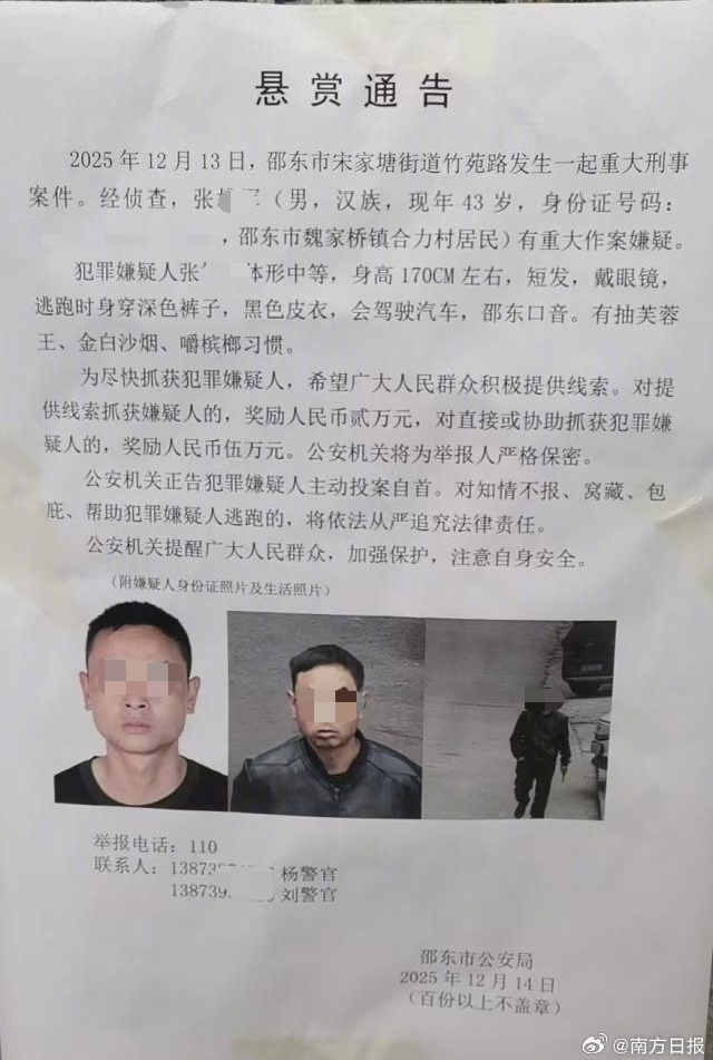 12月14日,湖南邵东警方发布悬赏通告称,重大刑事案件嫌疑人张某某13日犯案后潜逃。