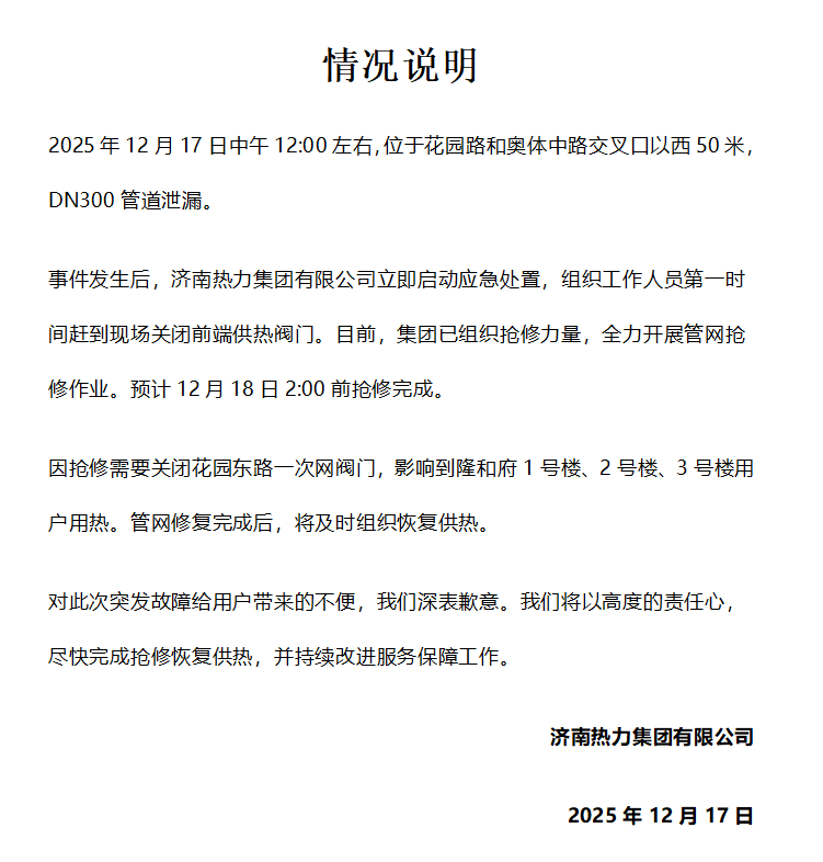 济南奥体中路附近供暖管道泄漏,官方最新回应:预计18日凌晨2点前修复齐鲁晚报·齐鲁壹点客户端 李梦瑶 2025-12-17 17:40:43原创12月17日,济南花园路和奥体中路交叉口附近供暖管道泄漏。齐鲁晚报·齐鲁壹点记者了解到,目前济南热力集团有限公司正全力开展管网抢修作业,预计12月18日2:00前抢修完成。大众新闻·齐鲁壹点记者 李梦瑶责任编辑:袁野