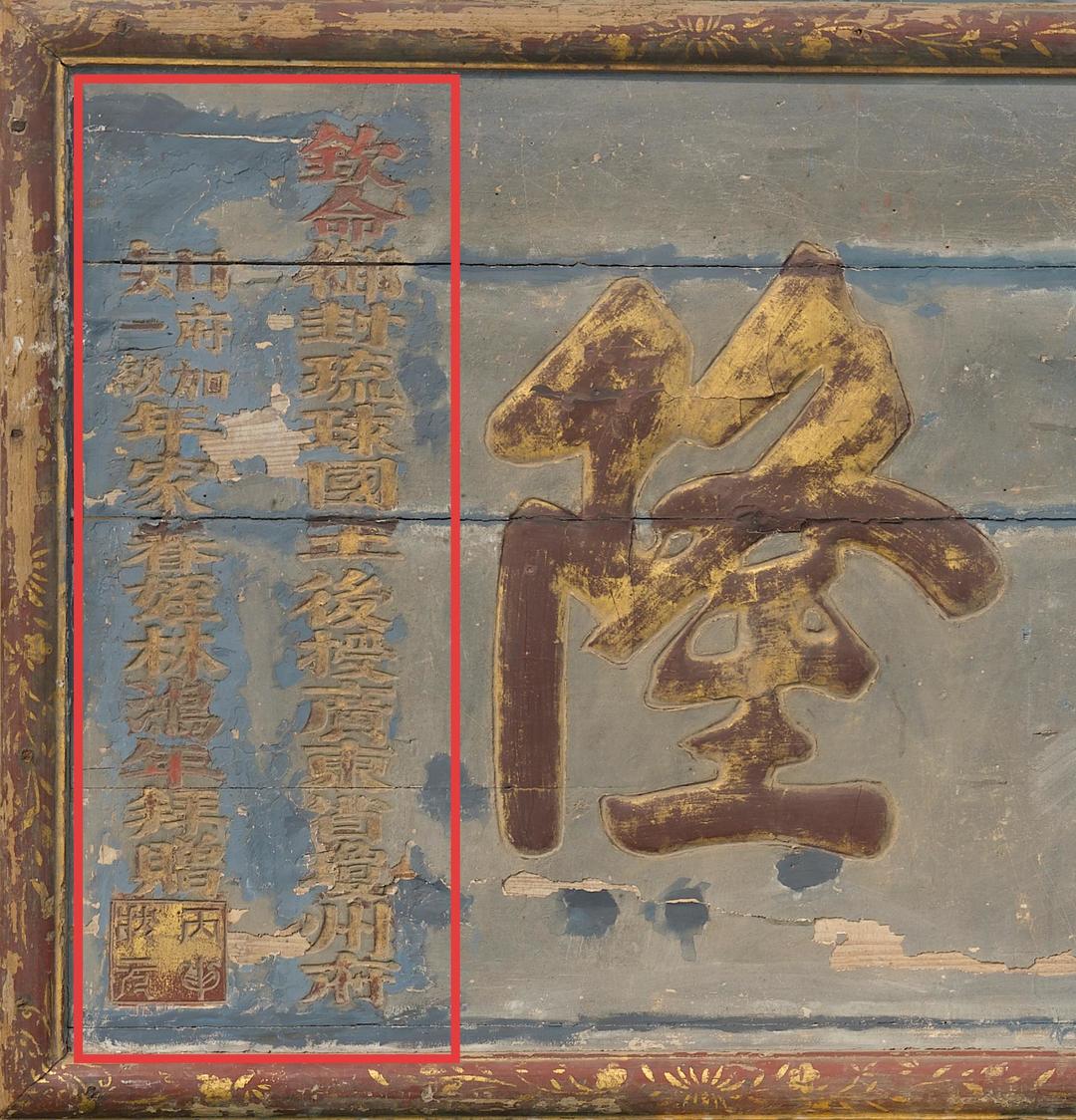 匾额最具价值之处,在于落款所呈现的清晰史实。“钦命御封琉球国王 ”八字,将清王朝对琉球实行册封的制度化关系保存于板之上。