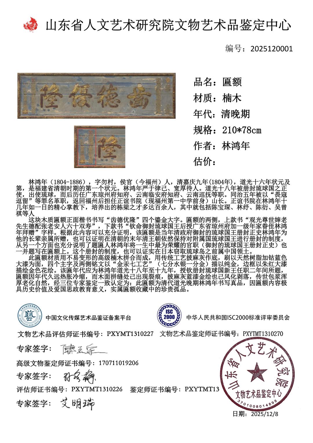 “齿德优隆 ”匾额长 210 厘米、宽 78 厘米,以行楷浮金书写四字主款,典雅大方、气象静穆。上款为祝寿之辞,下款落“钦命御封琉球国王后授广东省琼州府加一级年家眷侄林鸿年拜赠 ”。2013 年首次公开,立即引发学界与媒体关注,并经多位专家鉴定。专家一致认为,这是一块明清祝寿匾额的典型样式,但因题匾者身份特殊,这块匾额在数量众多的古匾中独具历史意义。据了解,林鸿年曾于道光十八年受清廷钦命, 出使琉球执行册封大典,其官衔写入匾额, 弥足珍贵。