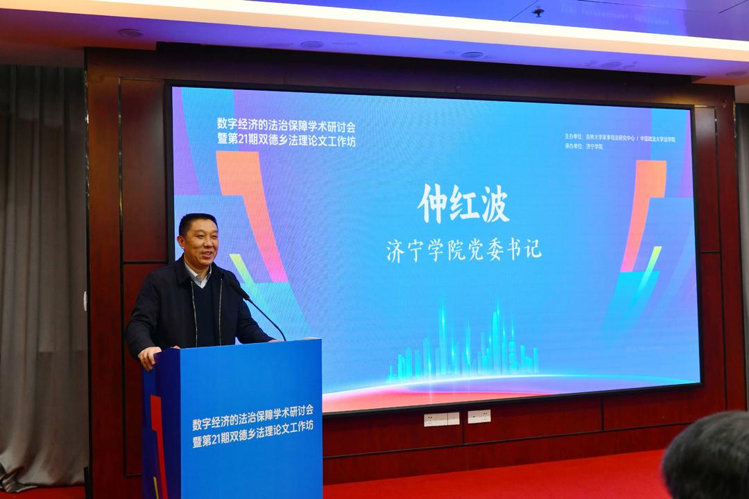 仲红波致欢迎词。他代表济宁学院全体师生对参加学术研讨会的各位嘉宾、专家学者表示热烈欢迎。他说,儒家思想与法家思想作为中华优秀传统文化的重要组成部分,蕴含着丰富的治理智慧和法治理念,对当今数字经济的法治保障研究具有重要启示意义。济宁学院根植孔孟之乡,沐浴圣地儒风,坚持突出儒家文化办学特色,围绕数字经济和乡村振兴战略,持续推进学科专业建设,致力于数字经济法治保障领域的研究与实践,服务地方经济社会发展。他表示,济宁学院将以此次研讨会为契机,进一步加强与各高校、科研机构的交流合作,期望与专家学者深入交流、碰撞思想,共同探索数字经济法治保障的新路径、新方法,为数字经济的健康发展提供坚实的法治理论支撑,为传承和弘扬中华优秀传统文化注入新的时代内涵。