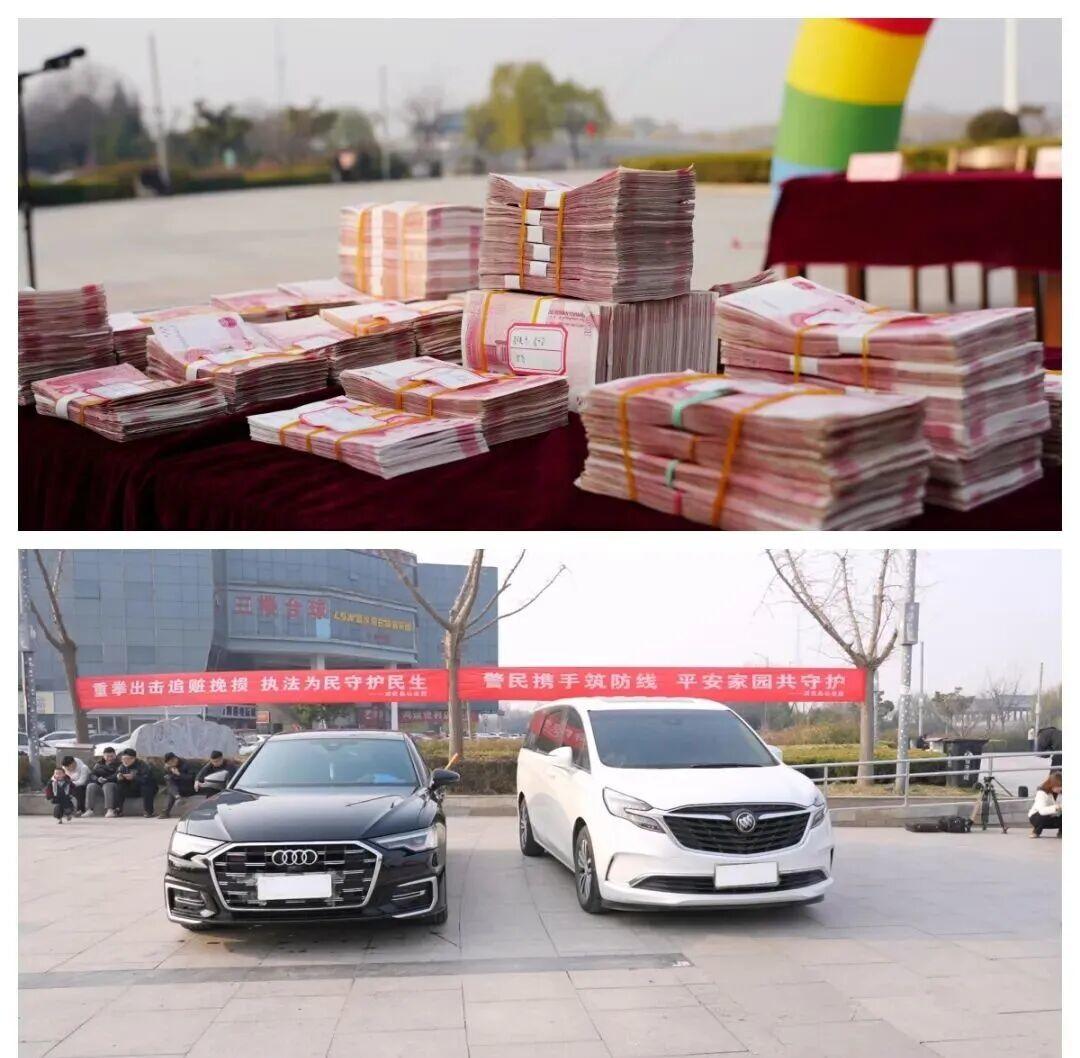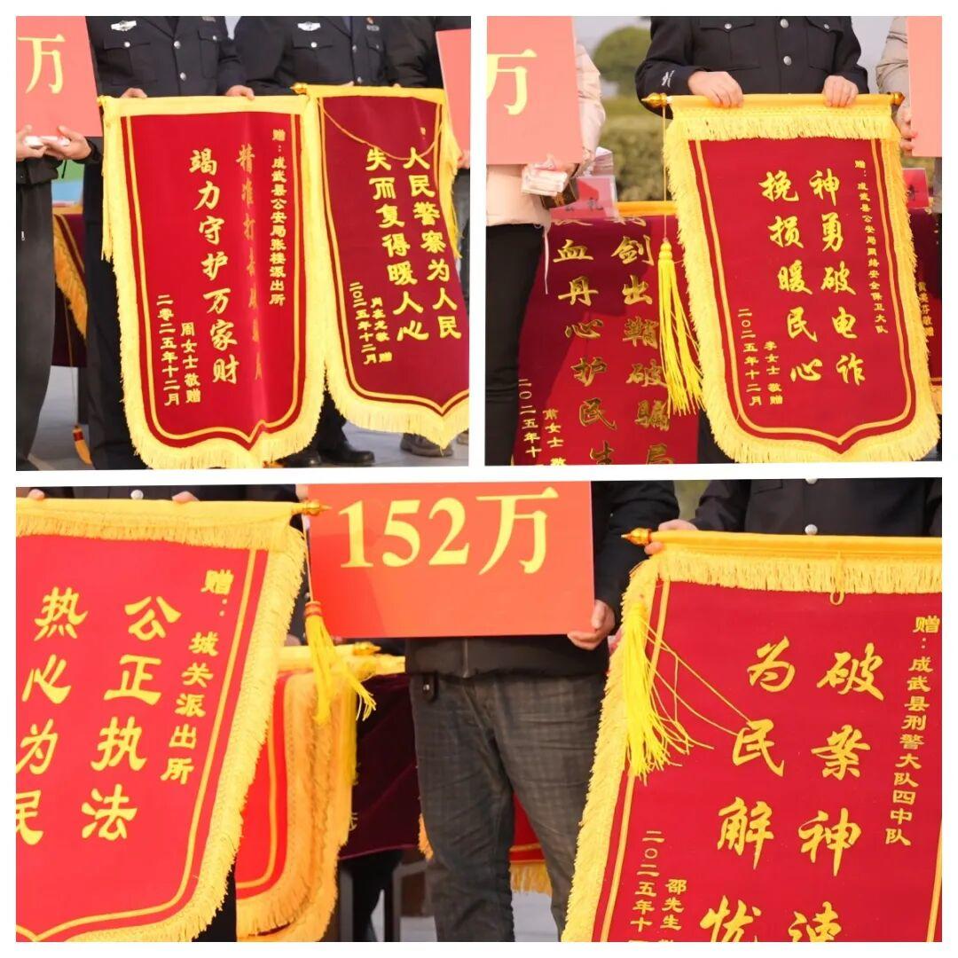 下午2时30分,退赃大会正式开始。现场气氛庄重热烈,一摞摞追缴返还的现金、一辆辆排列整齐的车辆等涉案财物集中陈列,总价值400余万元。受害群众依次上前,领回了属于自己的财物,喜悦之情溢于言表,并自发送上锦旗表达由衷感谢。