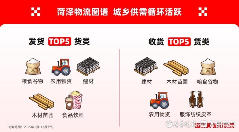 聚焦到菏泽,年轻司机挑大梁趋势明显。菏泽籍的司机师傅们,平均年龄不到30岁,散发出物流力量的蓬勃活力。粮食、农资从菏泽大量运出,这是“农业大市”的根基。建材、木材苗圃关乎城市建设与绿色产业,也在发货TOP 5行列。同时,菏泽运进建材、木材和服饰布料等,展示出充满活力的城乡经济循环。