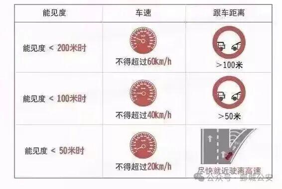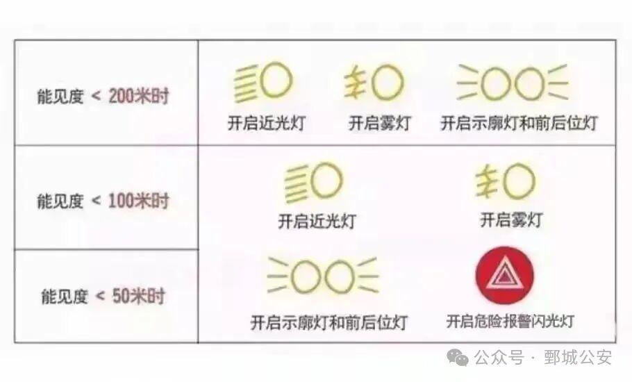 保持较低车速。雾越大,可视距离越短,车速就必须越低。当能见度小于200米大于100米时,时速不得超过60公里;能见度小于100米大于50米时,时速不得超过40公里;能见度在30米以内时,时速应控制在20公里以下;如果在10米以内就建议找一个绝对安全的地方停车。