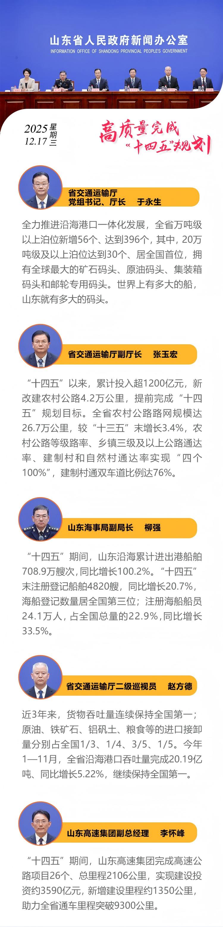 海报|山东的5年故事:世界上有多大的船,山东就有多大的码头山东发布 | 2025-12-17 19:20:31 原创杨烨莹 李亚平来源:大众新闻微信扫码扫码下载客户端12月17日下午,山东省人民政府新闻办公室举行“高质量完成‘十四五’规划”系列主题新闻发布会,邀请山东省交通运输厅主要负责同志等介绍“十四五”时期山东全面构建综合交通运输体系情况 。(大众新闻记者 杨烨莹 李亚平 策划 陈巨慧)责任编辑:韩雨婷