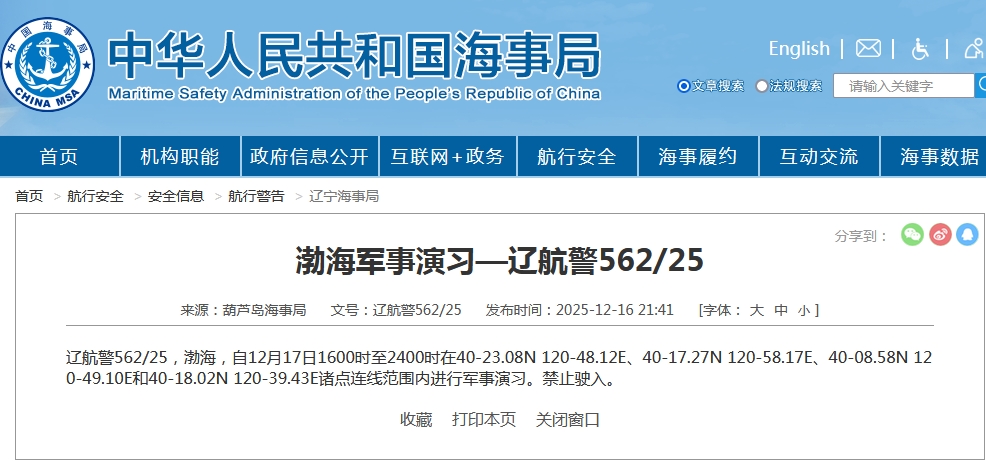 航行警告!渤海部分海域进行军事演习中国海事局网站 2025-12-17 19:06:06据中国海事局网站消息,葫芦岛海事局发布航行警告,12月17日16时至24时,渤海部分海域进行军事演习,禁止驶入。(中国海事局网站)责任编辑:帅为