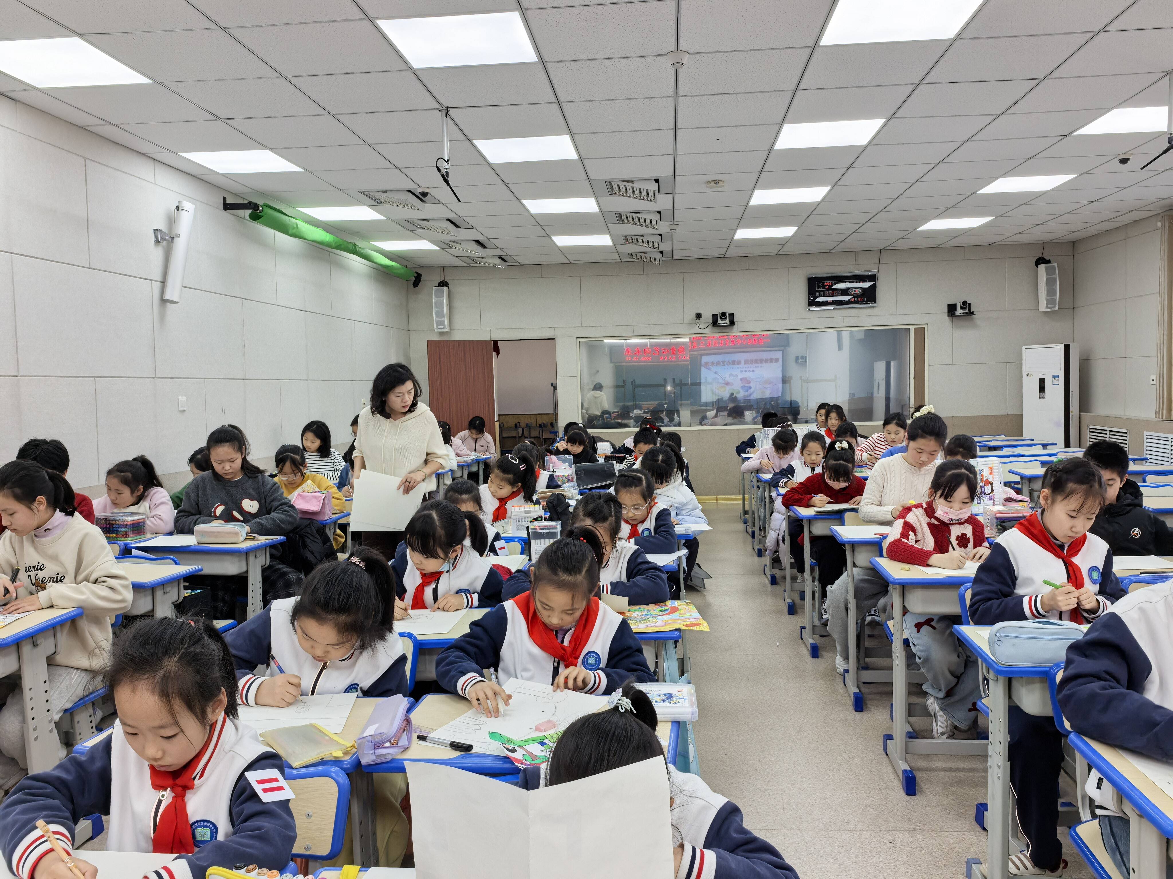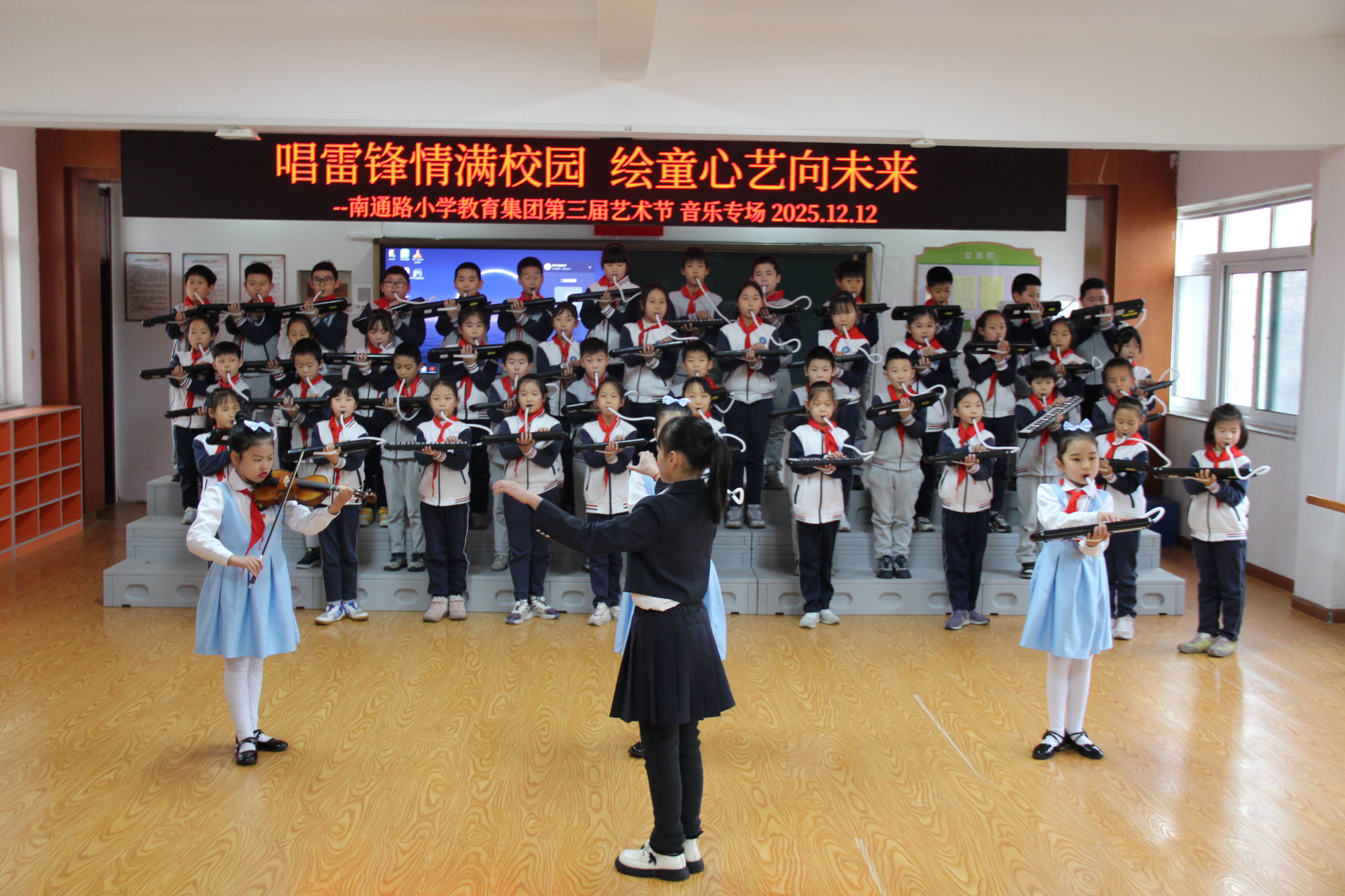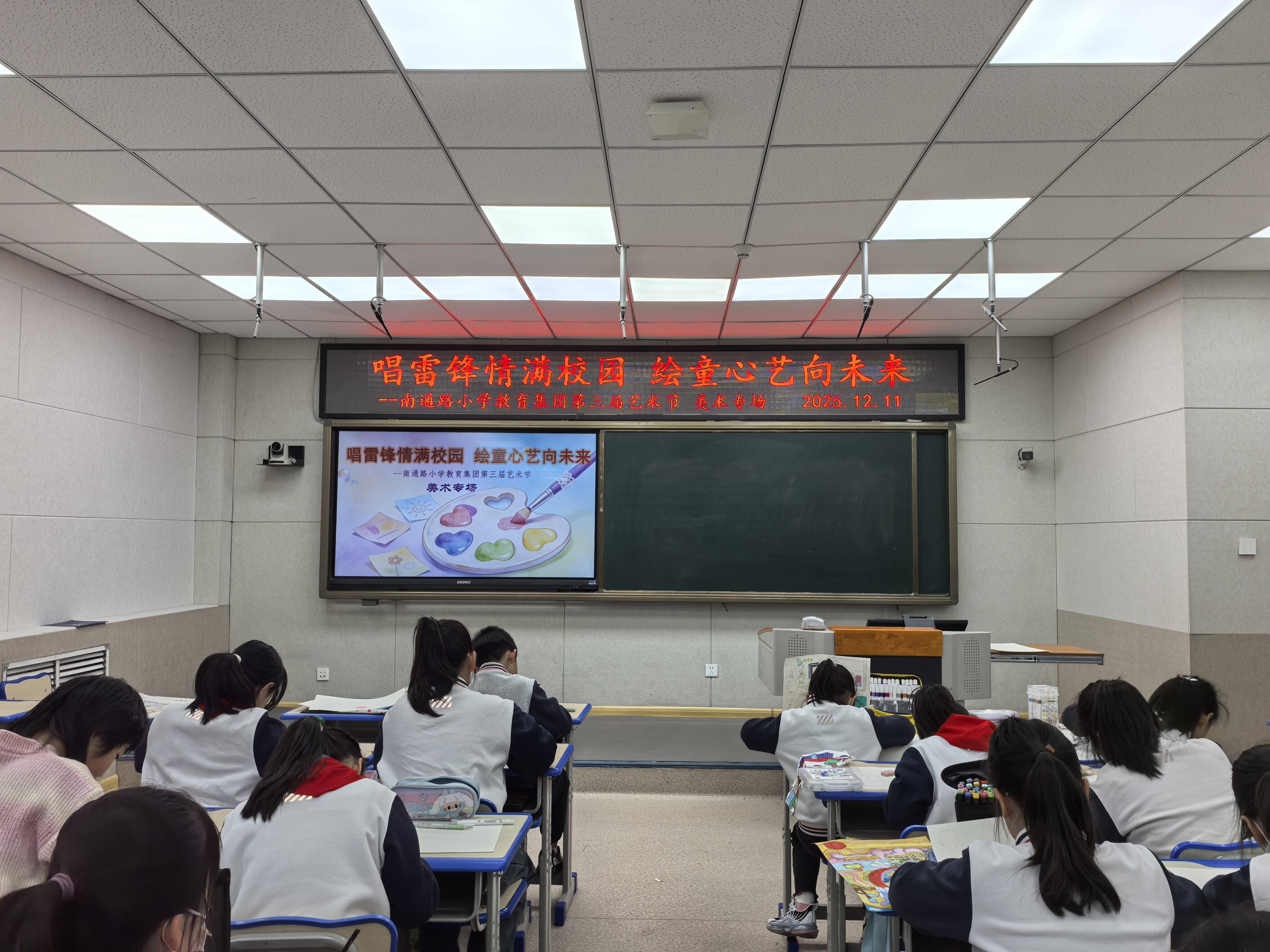 12月11日的美术专场亮点纷呈,各年级围绕专属主题创作。一二年级开展“剪贺新年 纸韵年味”创意剪纸,三四五年级分别以校园生活、自然风光、未来想象为主题进行现场绘画,同学们用多样工具与技巧,定格美好、畅想未来。12月12日的音乐专场同样精彩,一二年级传唱雷锋歌曲,用嘹亮合唱传递正能量;三四五年级进行口风琴表演,健康向上的曲目展现扎实艺术素养。