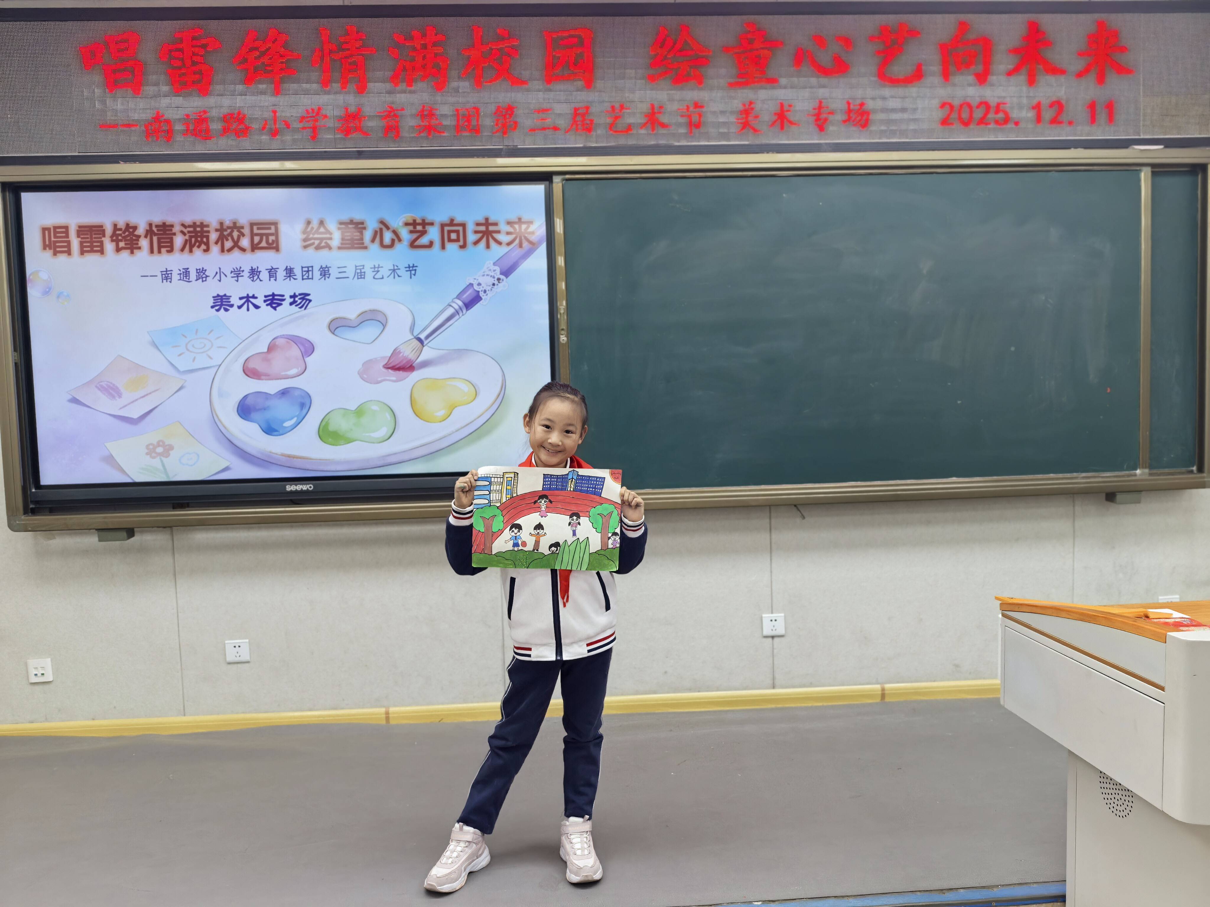 近日,烟台市芝罘区南通路小学以“唱雷锋情满校园 绘童心艺向未来”为主题的第三届校园艺术节顺利落幕。活动紧扣“五育并举”与“和美文化”理念,分设美术、音乐两大专场,1-5年级全体学生全员参与,在艺术实践中收获成长。