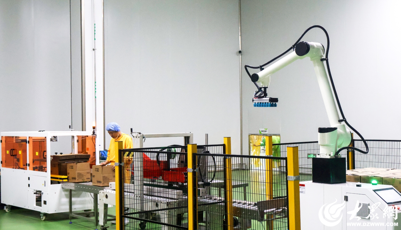 在山东花哚食品有限公司外包装车间,全自动生产线高速运转,从速冻隧道输送过来的肉制品连贯而出。通过机械抓手装箱,经封口、码垛等工序,一箱箱食品被整齐打包。