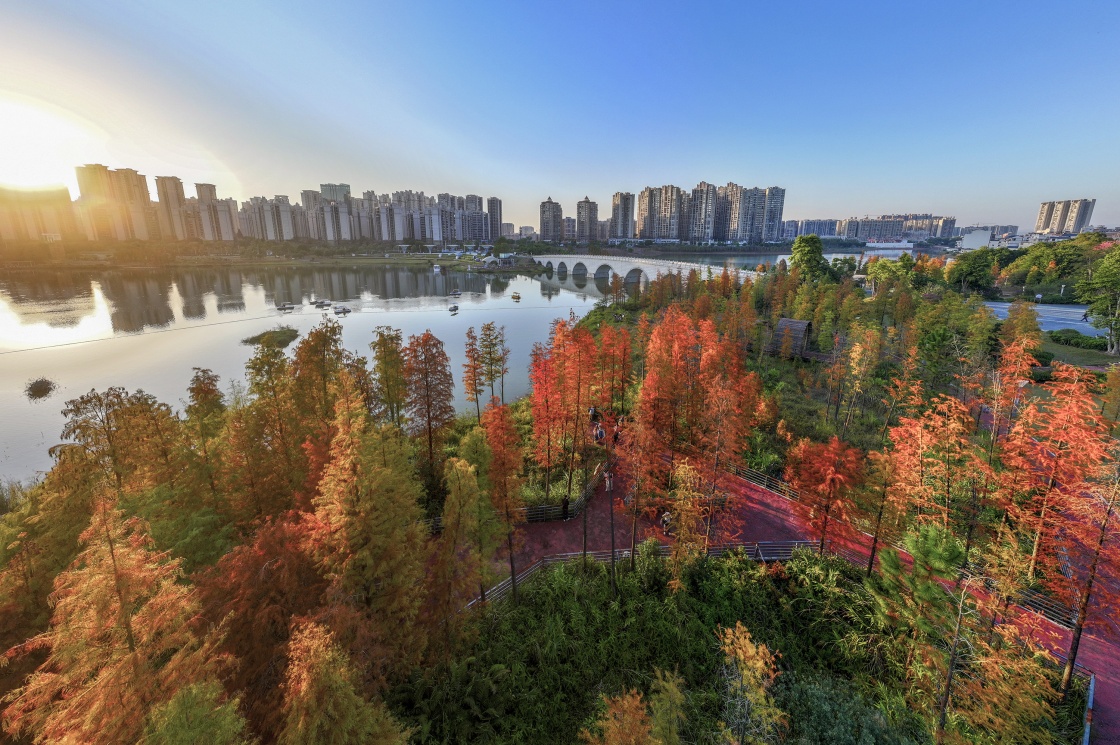 12月15日,游客在广西梧州苍海公园观赏游玩(无人机照片)。新华社