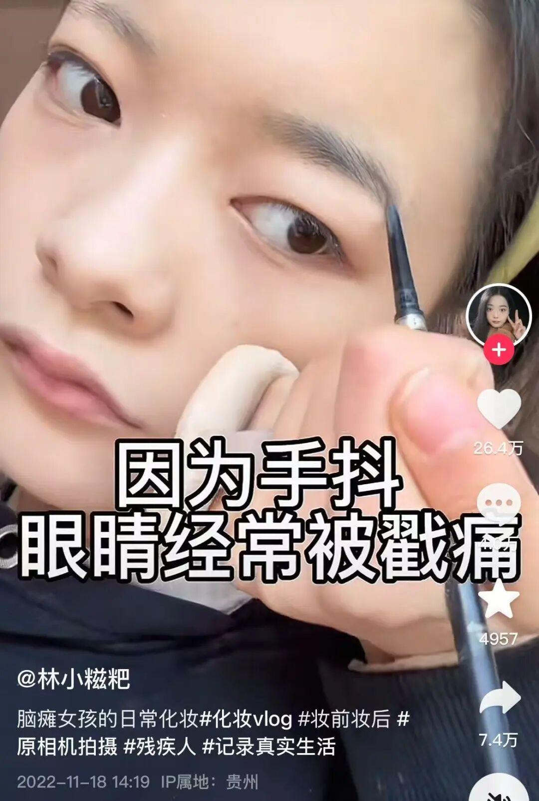 2017年,林玲注册了社交账号,并取名“林小糍粑”。此后,林玲鼓足勇气发布了第一条美妆视频——脑瘫女孩的化妆日常。