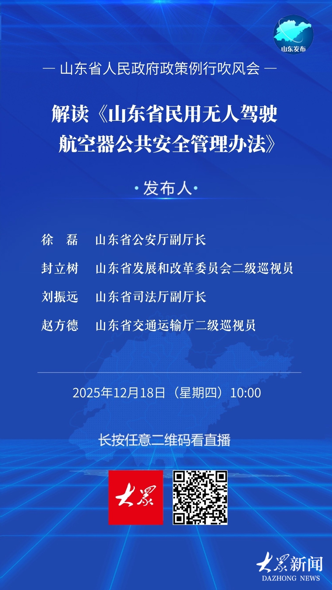 事关民用无人驾驶航空器!今天上午10时山东省政府将举行政策例行吹风会山东发布 | 2025-12-18 08:03:05 原创崔晗 申家鑫来源:大众新闻微信扫码扫码下载客户端山东省政府新闻办定于12月18日(周四)上午10:00举行省政府政策例行吹风会,邀请省公安厅负责同志等解读《山东省民用无人驾驶航空器公共安全管理办法》。(大众新闻记者 崔晗 申佳鑫)责任编辑:张誉耀