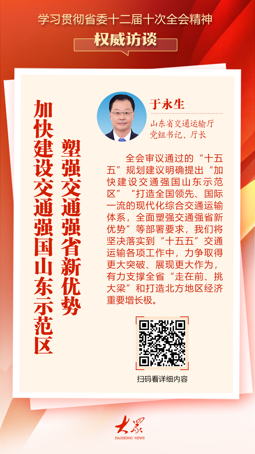 省委十二届十次全体会议深入贯彻习近平总书记视察山东重要讲话和重要指示批示精神,对标党的二十届四中全会各项部署要求,对今后五年全省经济社会发展进行了精心谋划和系统安排,全会审议通过的“十五五”规划建议明确提出“加快建设交通强国山东示范区”“打造全国领先、国际一流的现代化综合交通运输体系,全面塑强交通强省新优势”等部署要求,我们将坚决落实到“十五五”交通运输各项工作中,力争取得更大突破、展现更大作为,有力支撑全省“走在前、挑大梁”和打造北方地区经济重要增长极。