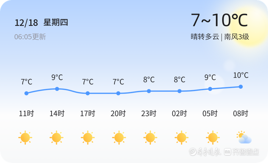 今天是12月18日,星期四,农历十月廿九。威海市今日天气晴转多云,气温介于7℃至10℃之间,南风3级,空气湿度为64%。PM2.5指数为65,属于良好级别,对市民健康无显著影响。当前温度为3℃,建议市民外出时注意保暖,适时添衣。出行时请注意防风,携带雨具以备不时之需。