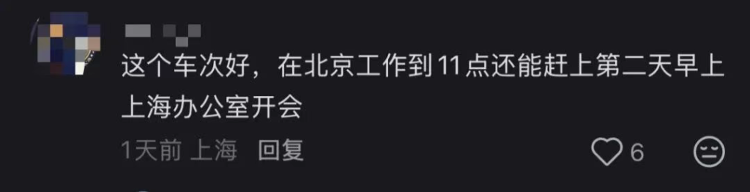在社交媒体上,京沪高铁常被戏称为“打工人专列”。对于该趟零点班次,有网友调侃称“在北京工作到11点还能赶上第二天早上上海办公室开会”。