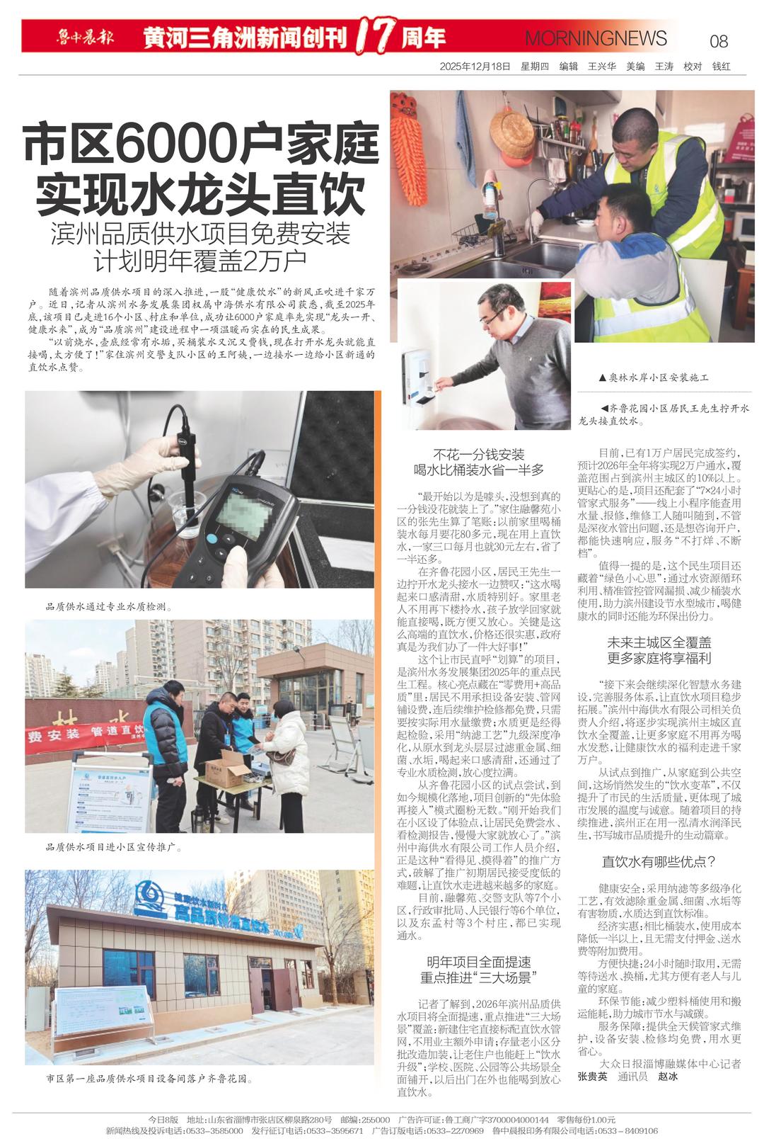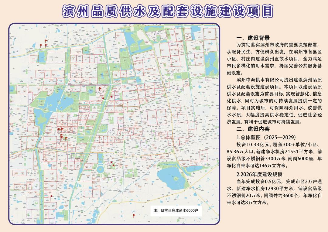 随着滨州市品质供水项目的深入推进,一股“健康饮水”的新风正吹进千家万户。近日,记者从滨州水务发展集团权属中海供水有限公司获悉,截至2025年底,该项目已走进16个小区、村庄和单位,成功让6000户家庭率先实现“龙头一开、健康水来”,成为“品质滨州”建设进程中一项温暖而实在的民生成果。