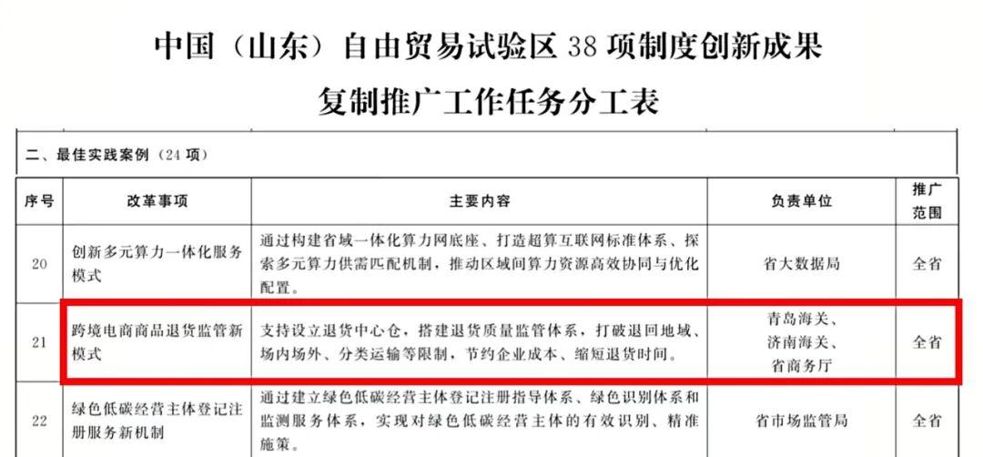 近日,记者从威海临港区商务局获悉,山东省人民政府发布《关于做好中国(山东)自由贸易试验区38项制度创新成果复制推广工作的通知》,临港区探索推出的跨境电商商品退货监管新模式获评最佳实践案例。